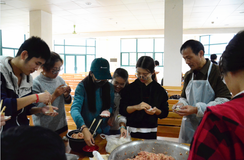 畅谈会进行的同时,其他志愿者也在为老人精心准备晚餐。活动人员有序地分成四组,与老人一起互动、包饺子。一些同学手工能力强,动作很快,做出来的形状,大小都很适宜,得到了老人们和工作人员的赞赏;一些同学尽管在这一方面不太熟练,但是也努力尝试,期间越来越多的老人加入了包饺子的队伍,很热心地一起帮忙。