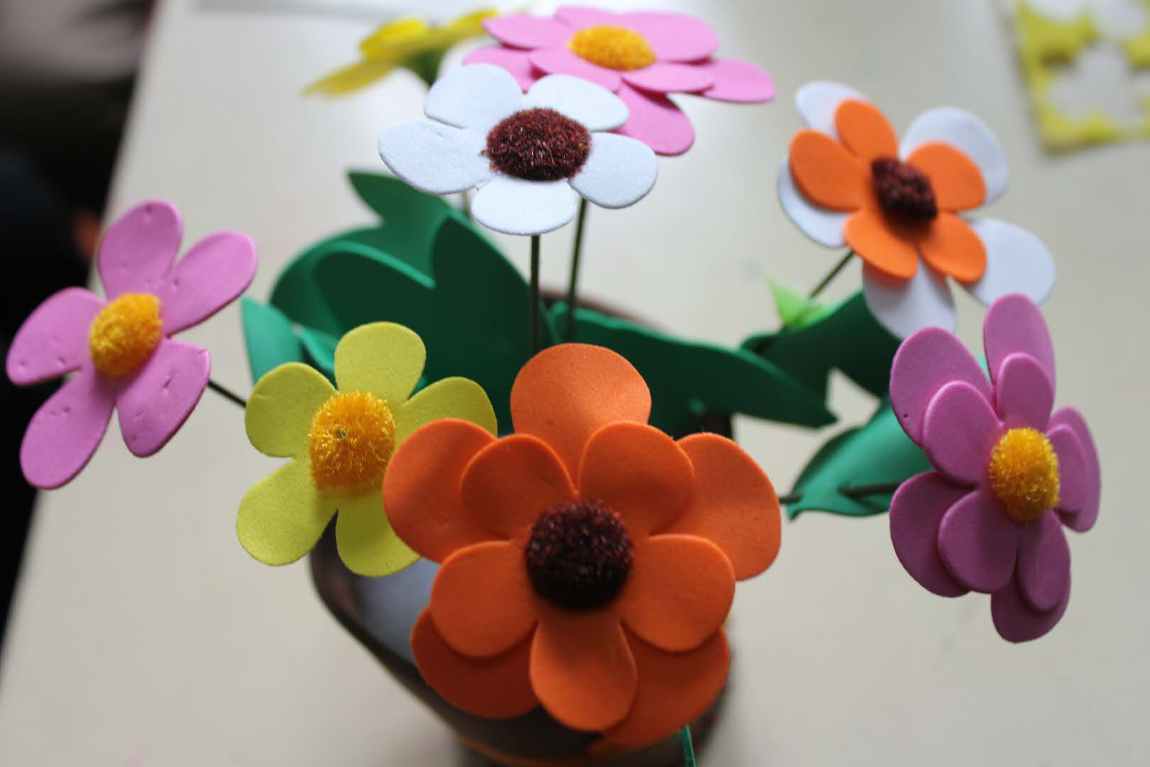 首先,活动的带队老师组织小朋友们学习了《种太阳》这一首简单欢快的歌曲舞蹈,以此迎接春天的到来!小朋友们在志愿者的带领下纷纷站起身,跳了一遍又一遍,乐在其中。短暂的休息过后,老师们又安排小朋友们和爸爸妈妈一起参与手工制作—做花篮。这便需要爸爸妈妈以及志愿者们的耐心,手把手带着小朋友们慢慢的一步一步亲手用老师所发的材料将花盆组合起来以及制作一朵朵精美的花朵。最先完成的作品的几个家庭又纷纷起身帮助那些还未完成的家庭,这也间接教会小朋友学会帮助他人。