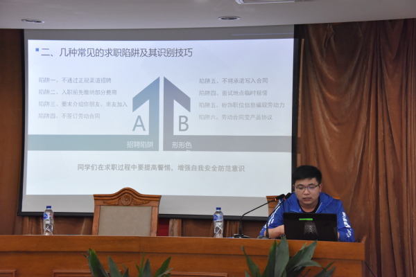 来自环境与资源发专业的研究生牛秉儒从当前社会的求职现状开始讲起,结合数起实际案例向同学们介绍了几种常见的求职陷阱及其识别技巧,并就如何规避这些求职陷阱提出了切实的建议。