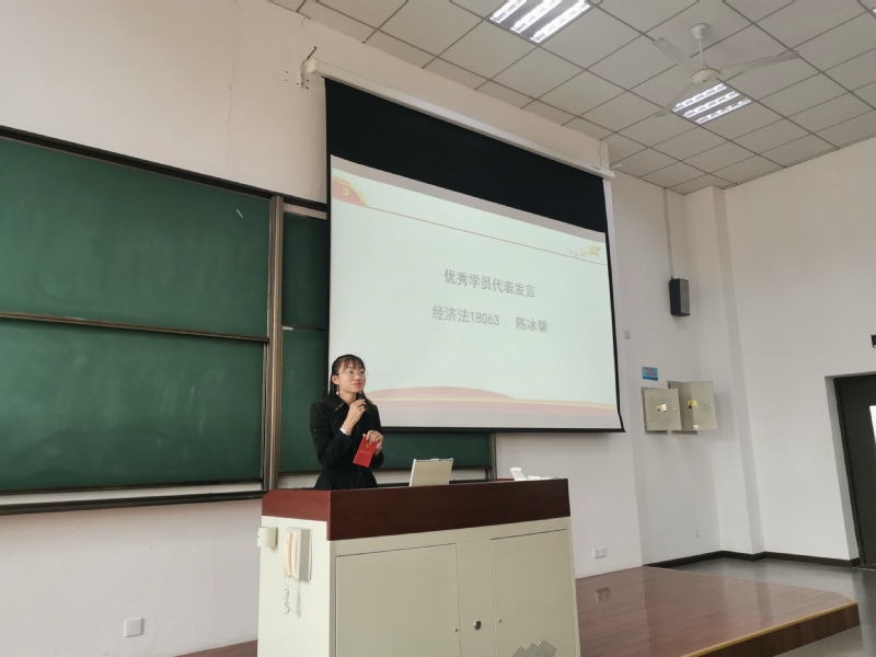 学生代表来自经济法18063班的陈冰馨发言,她表示,自己在此次培训学习活动中更深刻地理解了党的理论知识,收获良多。作为新时代的担当者,就更应该把党的理论知识运用到我们的生活实践中来,以党员的标准严格要求自己,把为人民服务作为我们一言一行的标杆,只有这样,我们才能成为一名合格的模范先锋,才担得起新时代的伟大重任。