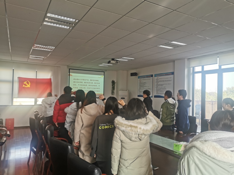 党员代表发言完毕后,全体新入党党员在领誓人贾佩婷的带领下,紧握右拳,庄严宣誓: