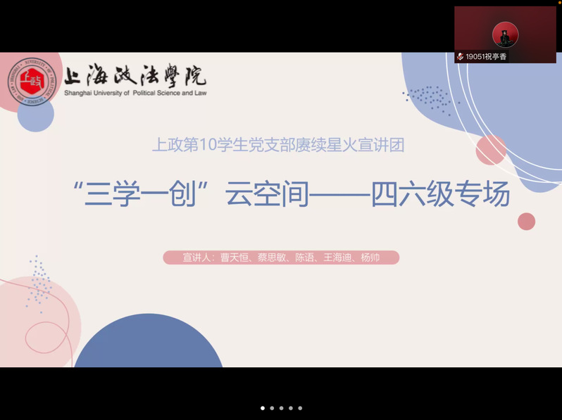 2022年4月16日,为深化落实“我为群众做实事”方针政策,丰富我院学子在封校期间的课余生活,促进我院学风建设,上政第10学生党支部于线上开展“三学一创”云空间英语四六级考试宣讲活动。支部书记颜涵老师和学生党员、入党积极分子以及经济法20061、21062、21063全体同学共150余人参与此次活动,活动由马艺瑄同学主持。