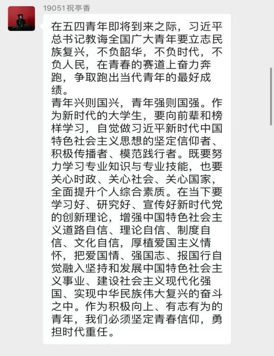 青年是整个社会力量中最积极、最有生气的力量,国家的希望在青年,民族的未来在青年。时代呼唤担当,民族振兴是青年的责任。新时代是追梦者的时代,也是广大青年成就梦想的时代。我们是与新时代同向同行、共同前进的一代,生逢盛世,肩负重任。作为青年,我们要按照习近平总书记提出的明确要求,以实现中华民族伟大复兴为己任,立大志、明大德、成大才、担大任。要坚定中国特色社会主义道路自信、理论自信、制度自信、文化自信。用脚步丈量祖国大地,用眼睛发现中国精神,用耳朵倾听人民呼声,用内心感应时代脉搏。在担当中历练,在尽责中成长,在实现中国梦的生动实践中放飞青春梦想,努力成为德智体美劳全面发展的社会主义建设者和接班人!