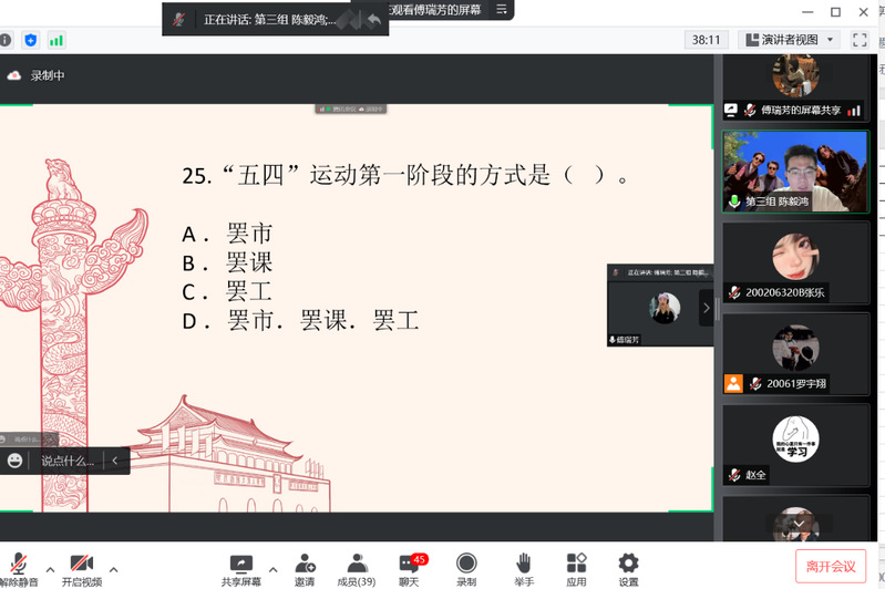 为厚植爱党爱国情怀,并结合当下疫情防控和我校实际,经济法学院开展了“弘扬五四精神,永葆爱国情怀”线上党史知识竞赛,本次竞赛分为初赛与决赛,分别于5月6日、5月8日在腾讯会议举行。经济法学院团委书记汪雪苑、各学生党支部书记丁雨凡、颜涵、熊婷以及学院兼职组织员黄怡婷、学院兼职辅导员赵全出席比赛。