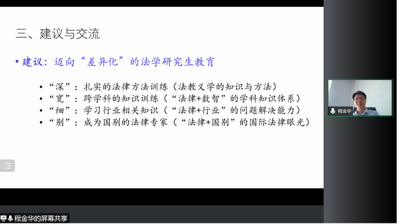 7月4日上午,上海交通大学研究生院副院长、凯原法学院特聘教授、博士生导师,教育部“青年长江学者”,上海交通大学中国法与社会研究院副院长、研究员程金华教授为研究生暑期学校作“‘新文科’和‘双循环’背景下的法学研究生教育”专题讲座。经济法学院商建刚副教授主持讲座。