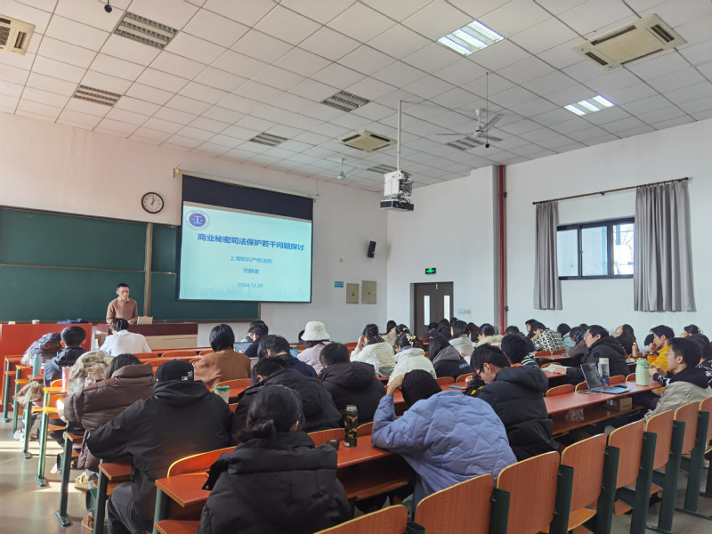 12月20日下午,上海知识产权法院知产二庭审判长范静波法官来校作“商业秘密司法保护若干问题探讨”实务讲座。经济法学院佟秀毓老师以及来自不同学院的120余名同学参加。