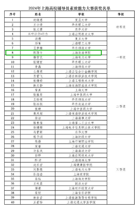 近日,上海高校辅导员素质能力大赛赛场传来喜讯,我院专职辅导员陈雨今老师凭借扎实的专业素养、出色的应变能力和卓越的育人风采,在大赛中脱颖而出,一举斩获一等奖,成功实现了我校在这一赛事上的重大突破。