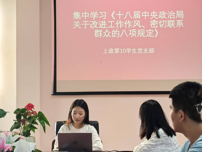 为深入贯彻中央八项规定精神学习教育,加强党支部五色理论学习课堂建设。2025 年 5月20日,上政第 10 学生党支部于B1-201组织开展了《十八届中央政治局关于改进工作作风、密切联系群众的八项规定》集中学习活动。本次集中学习由党支部书记周嘉晟主持,党支部宣传委员兼纪检委员冯思嘉担任领学人。