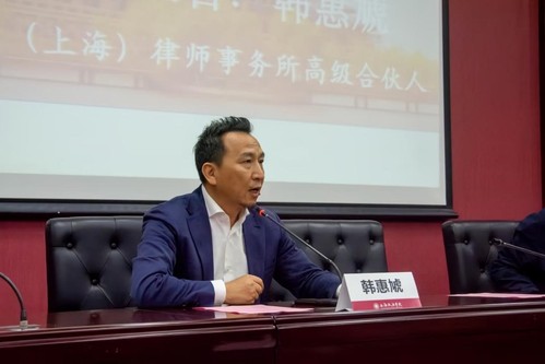 北京大成(上海)律师事务所的高级合伙人韩惠虓律师作为导师代表讲话,他深情寄语在场的法学生们,必须深入学习专业知识,培养扎实的专业技能。他强调了坚持公平与正义的重要性,并激励学生们要捍卫法律的尊严,鼓励同学们积极向上,努力成为有为之人。此外,他表达了对师生未来携手共进、共同奋斗的美好愿景。
