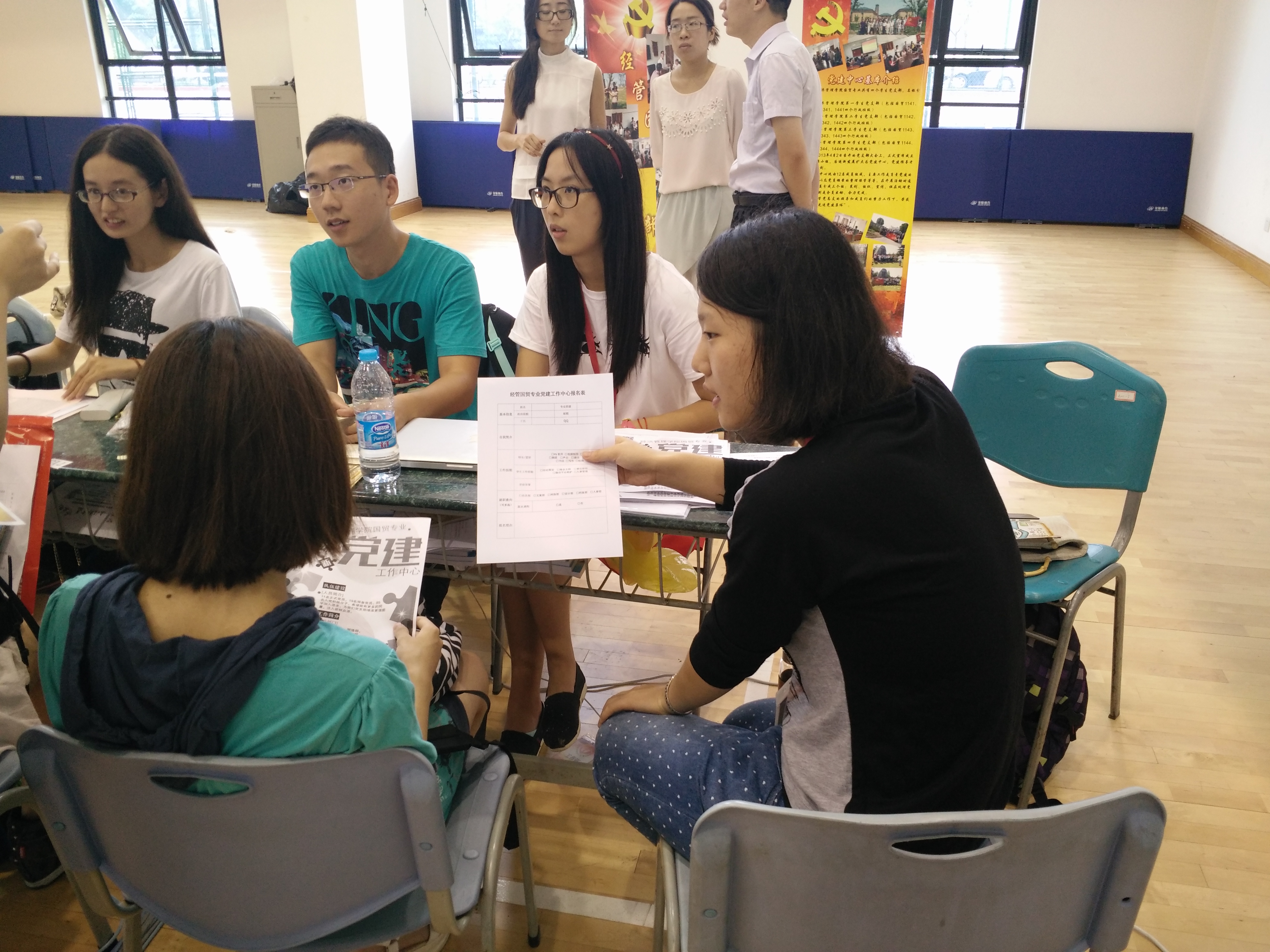2015年9月5日8:00整,经管国贸党建中心在训练馆开展迎新生志愿者活动,活动在党建工作组组长闫铁钊老师的带领下顺利举行。活动中同学们用心投入,踊跃参与。全体成员以饱满的工作热情和细心的工作态度,全面开展迎新工作。