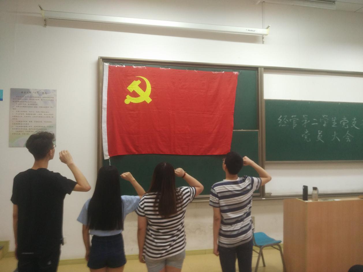 第二学生党支部党员发展大会系列会议第一次会议分别讨论了李凯铭、徐卓然、蒋露、王红4位同学成为预备党员的问题。发展对象分别上台宣读入党志愿书,汇报了对党的认识、入党动机、个人履历以及家庭和主要社会关系情况。随后,入党介绍人详细介绍发展对象的有关情况,并对其能否入党表明意见;最后与会党员对发展对象能否入党进行讨论并开展无记名投票。经票决,第一次会议决定吸纳上述4位同志为中共预备党员。支部书记邓华民同志带领新党员在党旗下进行了庄严的宣誓。第一次会议在雄壮的国际歌中休会。