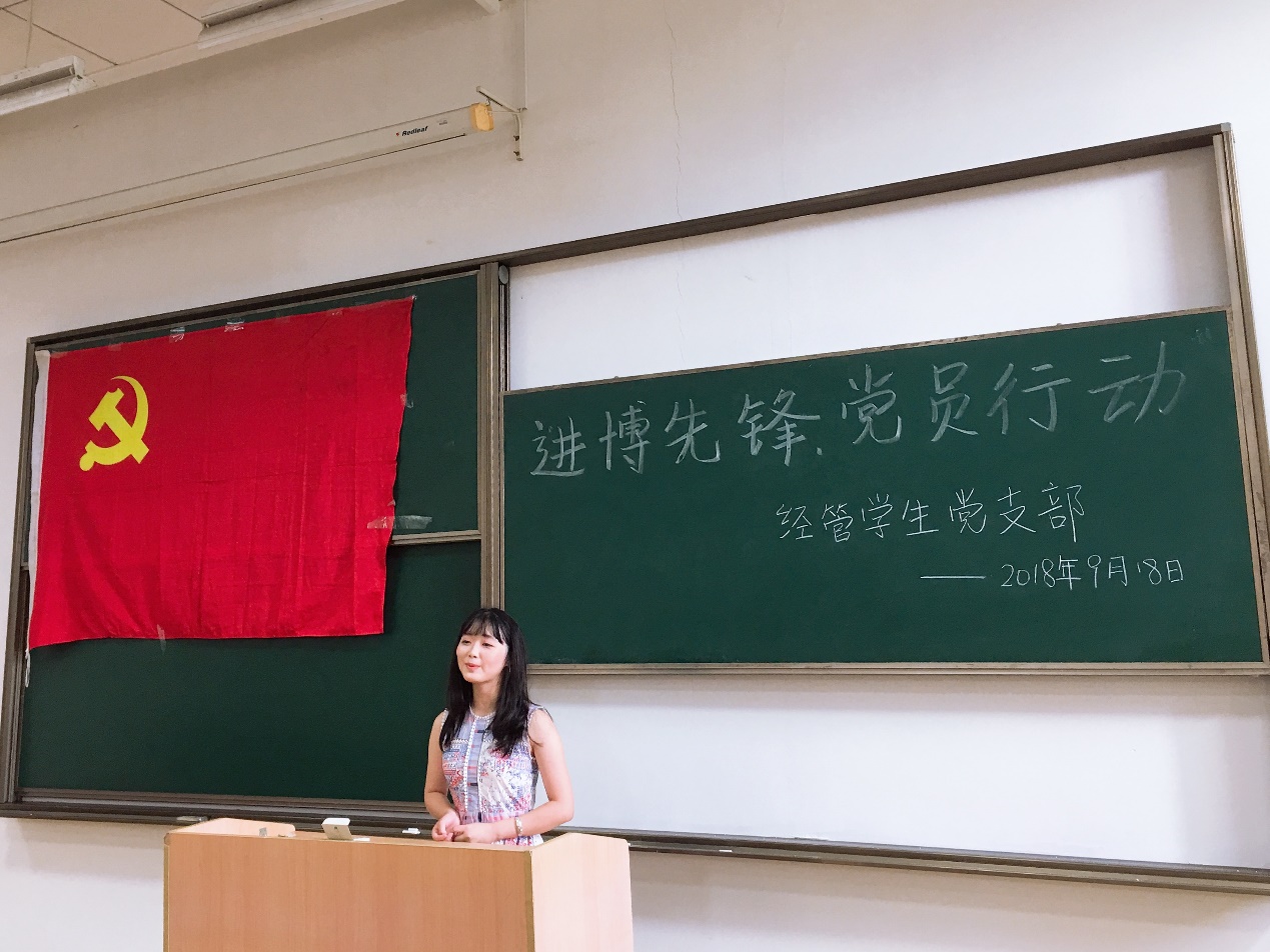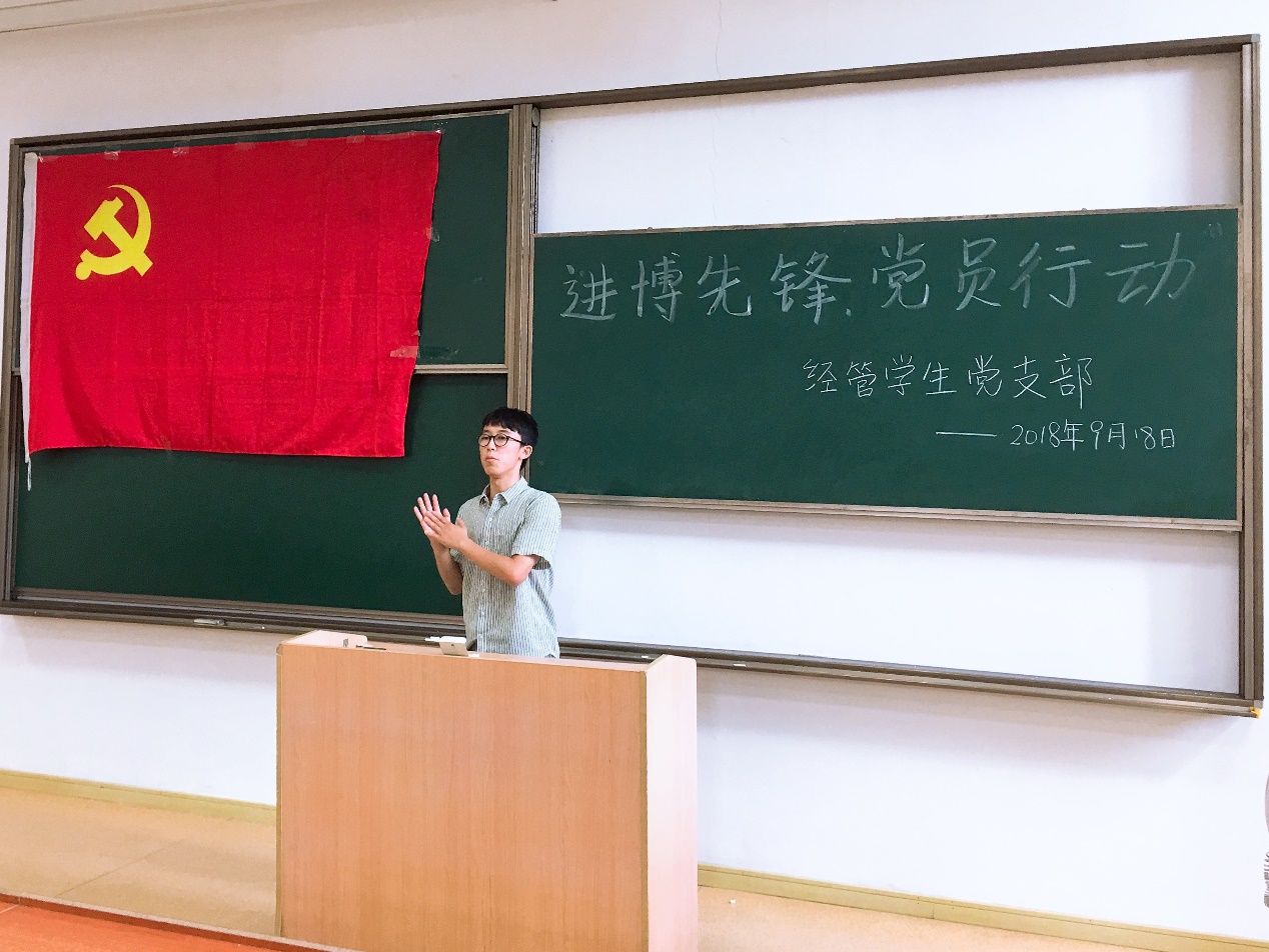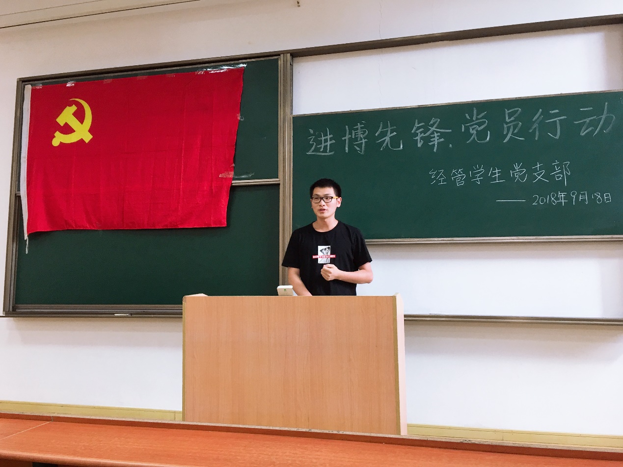 2018年9月18日下午2点,经济管理学院学生党支部“进博先锋,党员行动”党日活动在A8-101顺利展开。本次活动由经济管理学院党支部书记助理郭铖宋同志主持,全体党员以及25期积极分子到场参与,现场气氛严谨,井然有序。