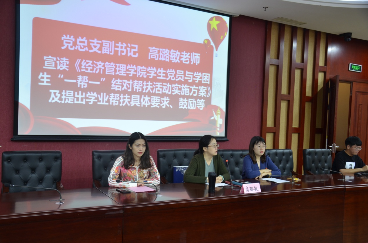 会议伊始,经济管理学院党总支副书记高璐敏老师宣读了《经济管理学院学生党员与学困生“一帮一”结对帮扶活动实施方案》。她介绍到第一批帮扶对象是45名急需帮扶的学困生,帮扶者则是一大批本专业高年级学生党员。她提出学生党员应积极热情地与学困生进行学业上地沟通、制定相应的帮扶计划,切实保证每周至少一次的帮扶辅导并由学生党员和学困生互相记在记录本上,检查学困生的学科作业完成情况,在考试月增加辅导活动等。高璐敏鼓励学困生积极主动地找老师、学生党员进行答疑解惑,学业事关的是自己的切身利益,在思想上要加强重视。