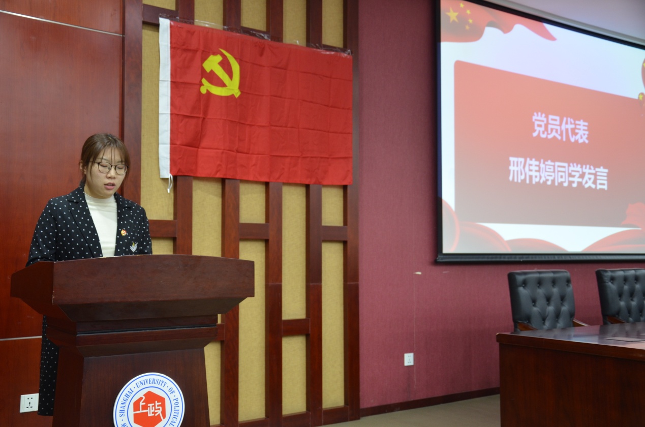随后由学生党员代表邢伟婷同学进行发言。她表示:学生党员党员,是学生中的先进分子与骨干,应该起到先锋模范作用,同时兼顾服务性与贡献性;党员的本质又是学生,应该以学习为首,做好自己的本职工作。