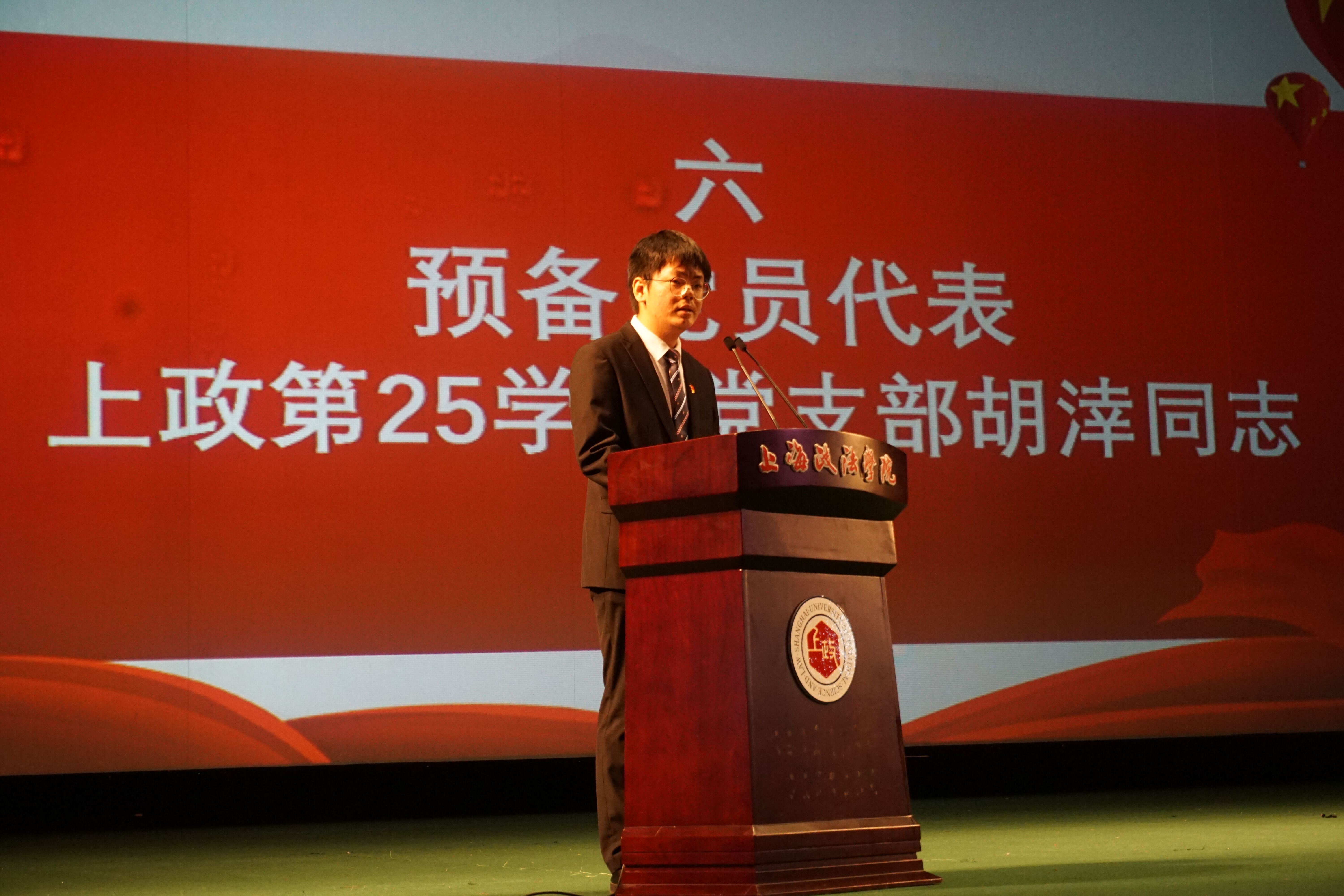 预备党员上政第25学生党支部胡涬同志发言。胡涬同志代表所有的预备党员,向培养考察他们的党组织、党员同志和各位老师表示了由衷的感谢。随后,他联系了自己过去的经历,从而认识到党员不是一份荣誉,而是一份责任与使命。接着,他代表54名预备党员向党组织表态。今后,他们会“发挥出作为学生党员的先锋模范作用,贯彻党全心全意为人民服务的宗旨,早日实现自己在思想上、行动上、能力上全方位入党,以优秀党员为榜样,不忘初心、砥砺前行!”