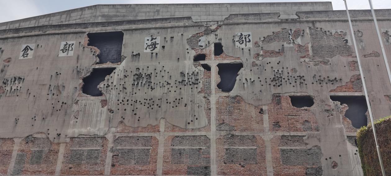 在四行仓库外,大家看到了“四行西墙”。六层高的墙体上布满430余个枪眼弹点,炮击造成的大面积墙体破损被真实而完整地保留下来。站在这样一面盛满历史故事的墙面前合影,党员们内心百感交集,既为这些为国奋战的壮士所打动,也为当时国家衰弱备受欺凌而痛心,更为如今强大的祖国感到自豪。