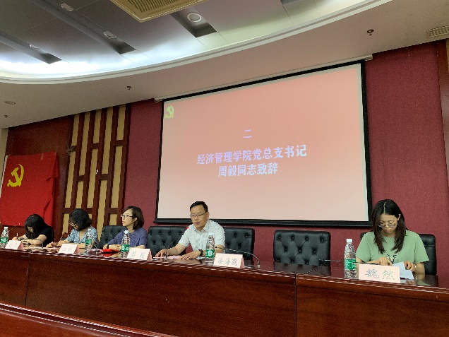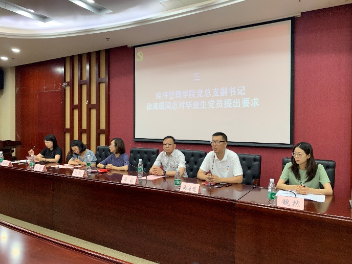 6月16日下午,经济管理学院2021届毕业生党员离校教育在综合研究中心107顺利举办。本次活动以“做勇立时代潮头的奋斗者”为主题,结合党的100年发展党史教育,帮助各位毕业生党员在今后可以自觉践行党的宗旨,保持共产党员先进性,继续发挥党员先锋模范作用。经济管理学院党总支书记周毅、副书记徐海琨、上政第26学生党支部书记江帆、上政第29学生党支部书记魏然、上政第30学生党支部书记刘雪出席本次活动,本次活动由经济管理学院党总支专职组织员徐璐主持。