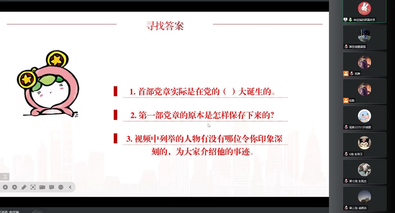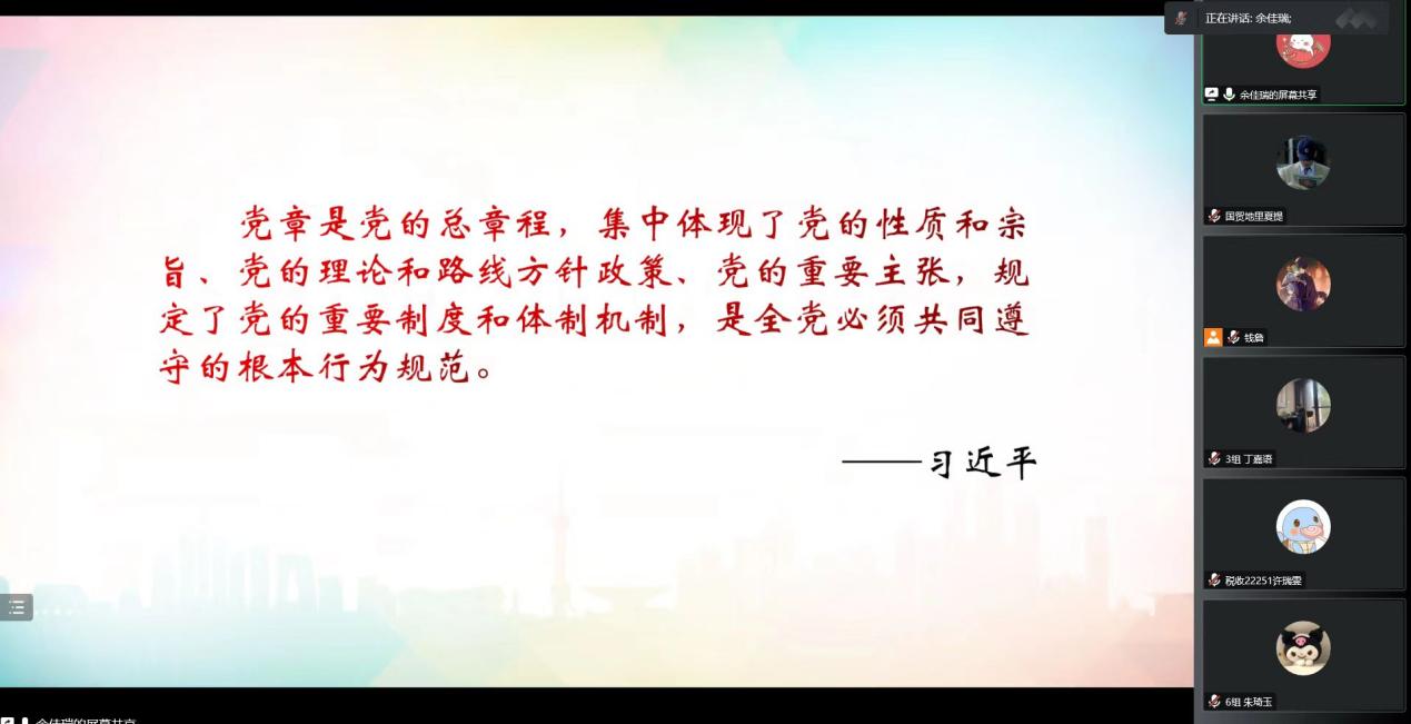 上政第27党支部书记余佳瑞为大家讲解第二节党课的主题—从党章修订看百年大党的光辉历程,首先为我们介绍了总书记对党章的定义,随后观看了百年党史视频,了解了党章的诞生以及党章的修订,中间穿插了关于党章的问答环节充分调动同学们的热情,而后又介绍了党章的守护人以及历代党章的修订过程,并为同学们深入讲解了党章核心,全面分析了党章修订历程与我党发展的联系,最后结合党的历程讲述了党章在党发展中各个时期中所具有的作用和意义。
