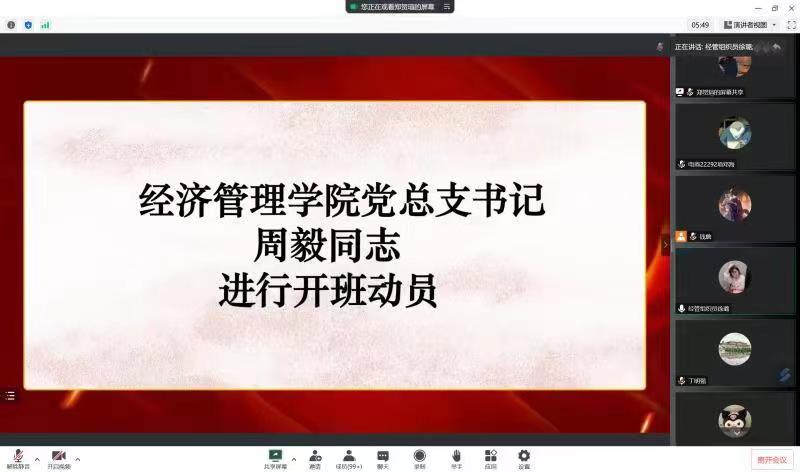 第三项,由经济管理学院党总支书记周毅同志做开班动员讲话。他在多个方面对培训班和各位学员提出了明确的目标、纪律和要求,希望大家能够夯实基础、增强学习,掌握好所必须的知识和本领。作为一名入党积极分子要成为学习的模范,不但要刻苦学习马克思主义理论,而且要学好专业知识,全面提升本领,力争早日成为一名光荣的共产党员并且深刻领会,提高认识,用二十大精神来武装自己的头脑。学习并贯彻好党的二十大报告精神,牢记空谈误国、实干兴邦,坚定信心、同心同德,埋头苦干、奋勇前进,为全面建设社会主义现代化国家、全面推进中华民族伟大复兴而团结奋斗。与此同时也要认清自我,查找差距,严格地用共产党员的标准来要求自己,努力向优秀的党员同志看齐,缩小差距,经受住党组织的考验。无论任何时候,无论遇到什么情况,都要始终坚信党的领导,认真执行党的各项方针、政策,毫不动摇地跟党走。