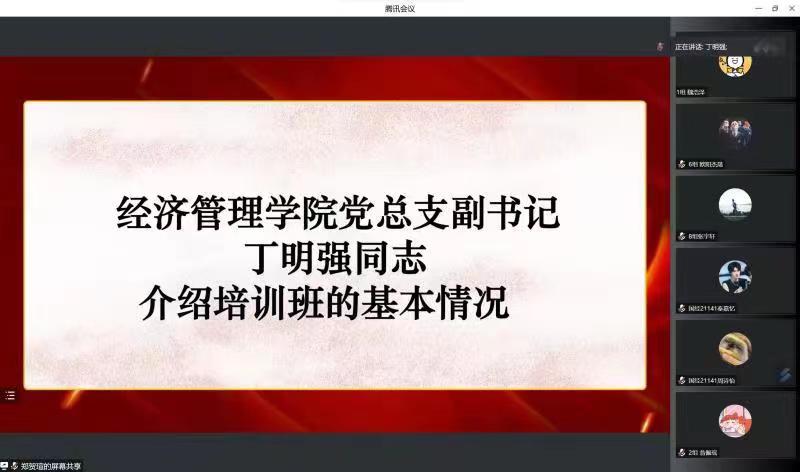 第二项,由经济管理学院党总支副书记丁明强同志介绍培训班的基本情况,内容主要包括开班典礼、专家讲座、结构化研讨、撰写党课小结、结业考试和结业典礼,表示此次培训活动旨在提高党员队伍素质能力,为党员队伍注入新鲜血液,希望各位学员在此次培训活动中严于律己,学习贯彻党的二十大精神,积极弘扬伟大建党精神、弘扬延安精神,自信自强、踔厉奋发,风雨无阻向前行,能够早日加入党组织。