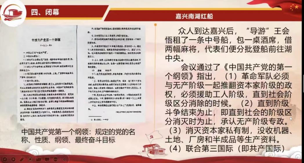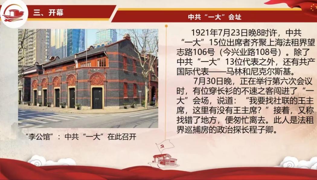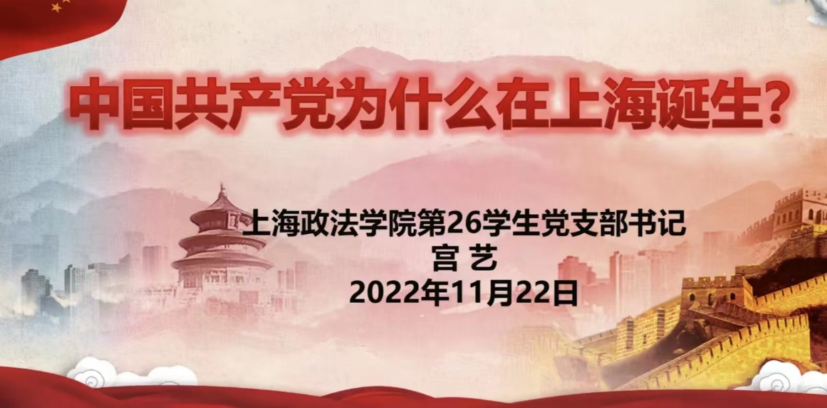随后,上政第26学生党支部书记宫艺为大家教授入党培训第一课——中国共产党为什么在上海诞生。在正式开始前,播放了一段有关建党的视频,引入本节党课的主题。进入正题后,她先是阐述了中国共产党在上海诞生是一种必然的原因:上海经济与政治基础、思想准备、国际力量、阶级基础各方面条件酝酿成熟。其次,她以地点为线索介绍了“一大”召开四部曲,从老渔阳里2号的酝酿、到博文女校的预备阶段、再到于“一大”会址的开幕、最终以嘉兴南湖的闭幕为收官。课程的最后,宫艺老师也通过播放一段视频以带领大家回顾中国共产党百年奋斗历程。
