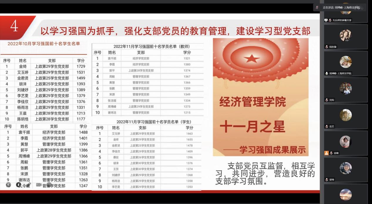 为全面贯彻落实党的二十大精神,提高党建工作水平,强化支部自身管理建设,12月27日上午,经济管理学院党总支于线上召开2022年度党支部书记抓基层党建述职评议会,学院党总支委员、各党支部书记参加。会议由组织员徐璐主持。