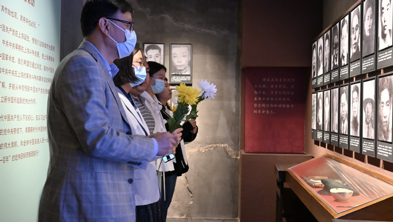 本次参观从一场生动的情景党课展开。在讲解员的带领下,教工党员们学习了中共三大的党史故事,回顾了北伐战争的相关史料,一起演唱了慷慨激昂的《北伐军歌》,深刻领会到中国共产党当年的艰难历程,再度回顾了那段烽火岁月。在扣人心弦的红色谍战故事之后,纪念馆设置了一场主题“密室逃生”,教工党员们被分为里外两支队伍,“里应外合”,一齐发挥眼力、脑力、心力,从重重谜题中找出逃生通路,最终成功会合。经过这场沉浸式体验,让教工党员们亲身感受到地下工作的残酷和先烈的艰辛。随后,教工党员跟随讲解员为在战争中牺牲的烈士们默哀献花,感怀先烈,纪念英魂。在鲜红的党旗下,周毅举起右拳,带领全体党员重温入党誓词,铿锵有力的宣誓声响彻大厅。