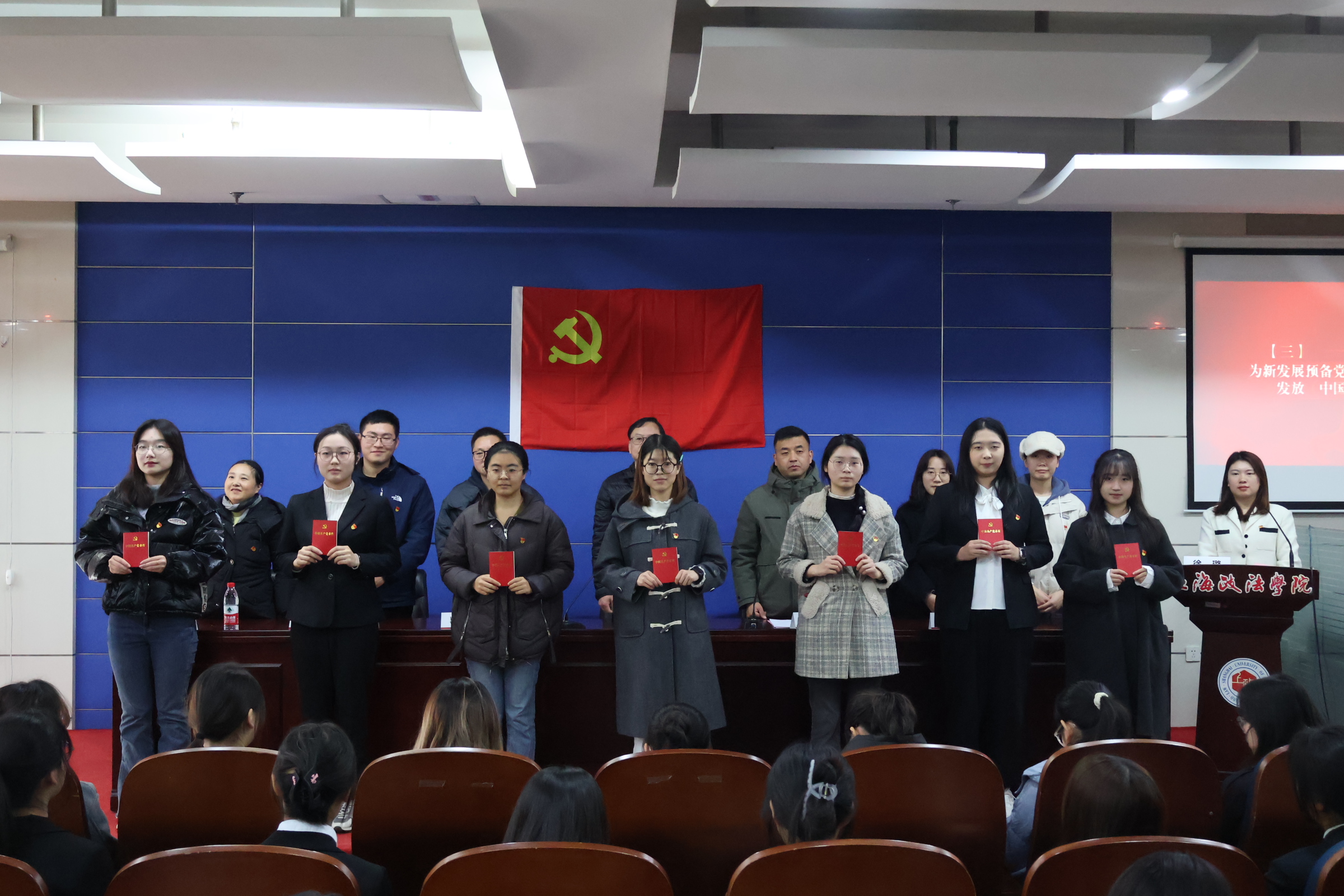 宣誓仪式上,经济管理学院党委副书记丁明强宣读了经上级党组织批准的39位新发展党员名单,各学生党支部书记为新党员们佩戴党员徽章、发放《中国共产党章程》。