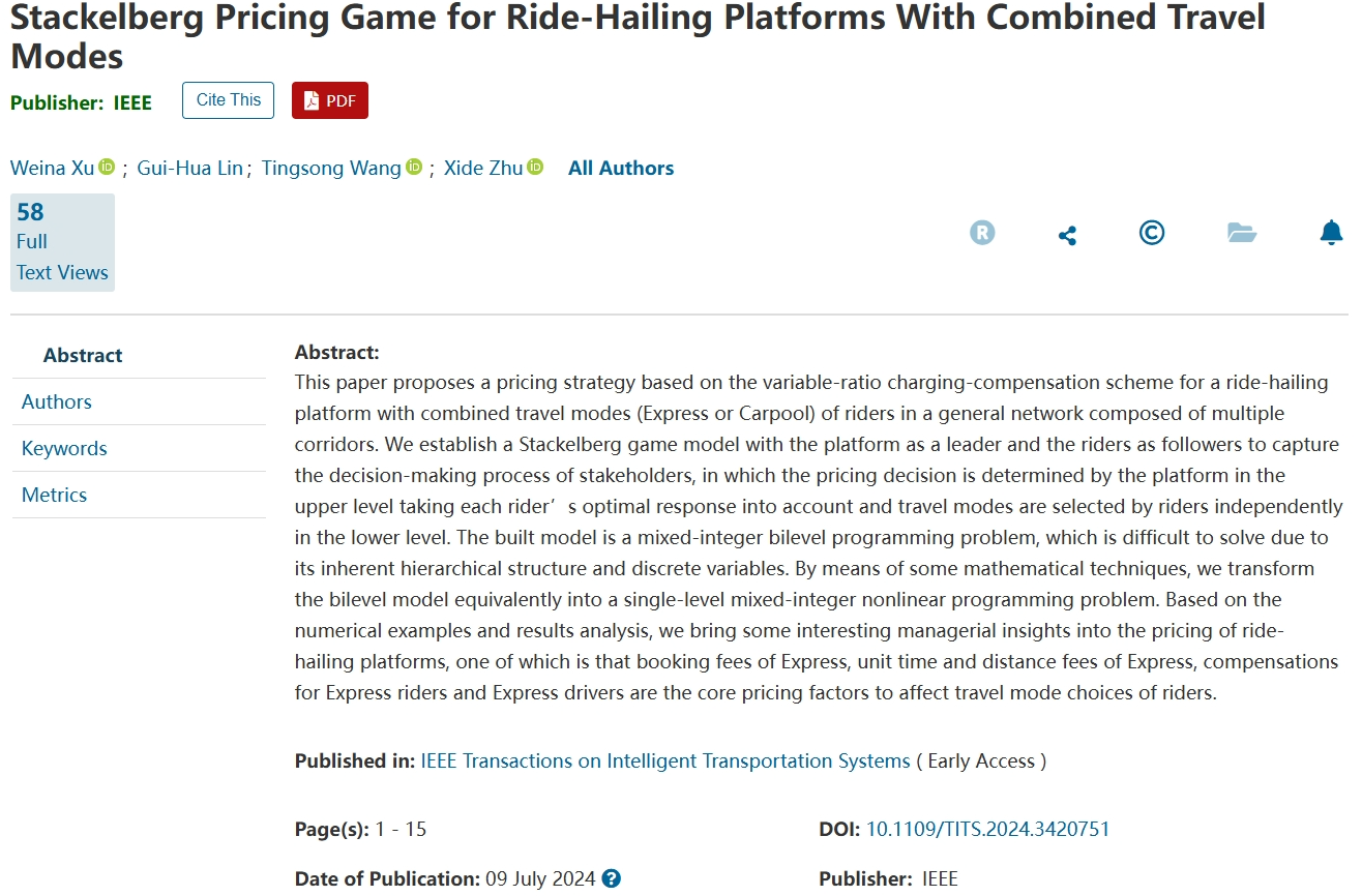 近日,由我院徐威娜老师联合上海大学合作完成的研究成果“Stackelberg Pricing Game for Ride-Hailing Platforms With Combined Travel Modes”在智能交通领域国际权威期刊IEEE Transactions on Intelligent Transportation Systems(IEEE TITS)发表,新利18官方客服为第一单位。这是我院“法商融合”领域的一项重要研究成果,推动了我院在相关学科领域的研究水平与影响力的持续提升。