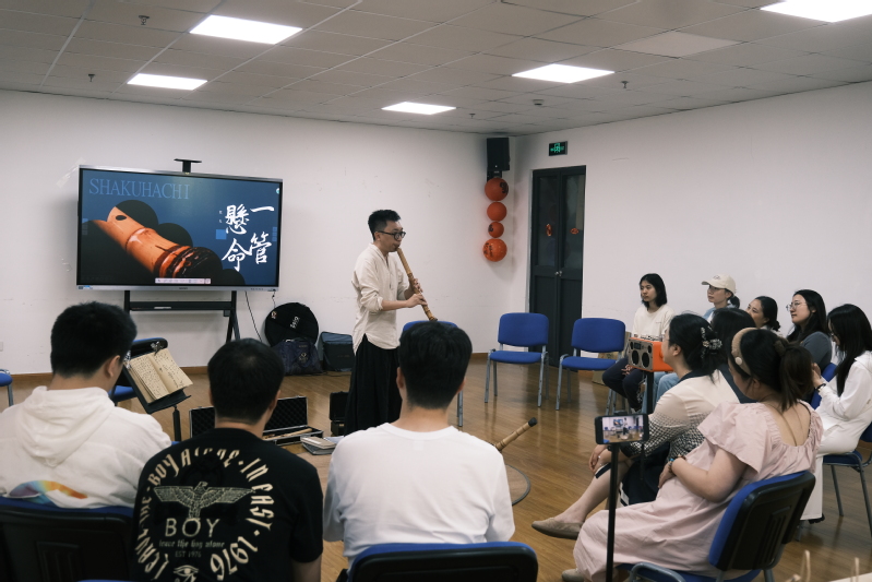 活动伊始,刘星显教授并未急于演奏,而是以“一尺悬命”为题,引领听众踏上音乐与哲思交织的旅程。他由尺八“一管通天地”的形制出发,深刻阐释了其背后蕴含的东方生命哲学——在气息吐纳、音声起伏之间,映照的是人对生命本真的体悟与执着。尺八不仅仅是乐器,更是修心问道的载体,每一次吹奏都是对“当下”的极致专注与珍视。这番将悠远乐理与深邃人生哲理相融合的讲述,为随后的音乐体验奠定了抚育心灵、启迪智慧的基调。