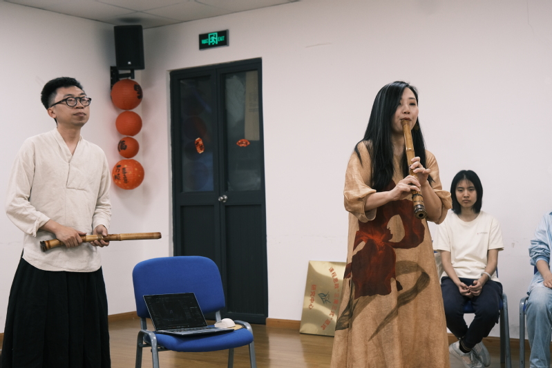 当尺八声真正响起,刘星显与李悉乐两位老师默契配合,展现了尺八艺术的非凡魅力与丰富情感层次。从古典名曲《虚铃》的深邃空灵、如泣如诉,到巧妙改编的现代流行旋律的亲切共鸣;从欢快明朗、如春日溪流跳跃的曲调,到沉郁顿挫、引人沉思的低徊乐章——曲目跨越古今风格,全面展现了尺八音色的表现力与疗愈潜能。那或清越或浑厚的声音,仿佛具有穿透喧嚣的魔力,引导在场师生暂离日常纷扰,在音波的共振中感受内心的宁静与情感的释放,完成了一次独特的身心调适。