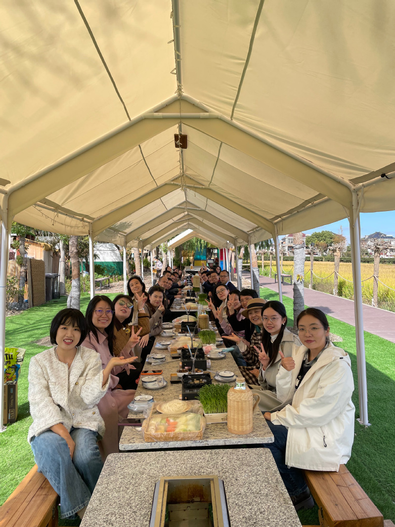 在抵达园区后,老师们首先在稻田边围坐享用火锅午餐。新鲜采摘的蘑菇与时令蔬菜一起翻滚在锅中,香气四溢、味道鲜美。田野风光与热气腾腾的火锅交织成一幅温馨的秋日画卷。