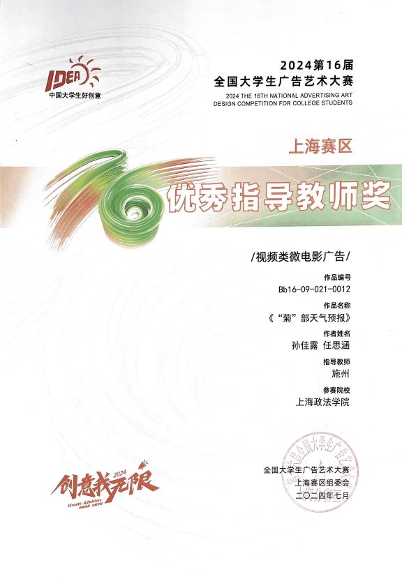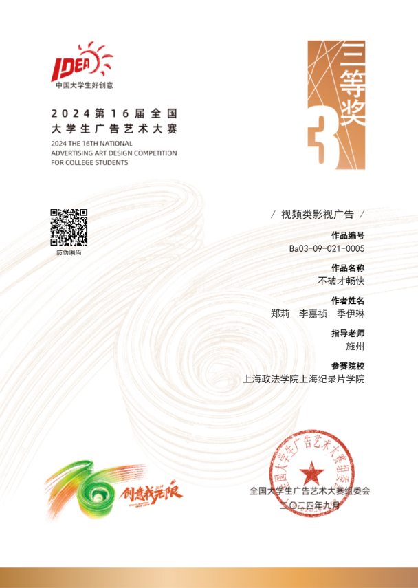 近日,在2024年第16届全国大学生广告艺术大赛(简称大广赛)上,新利18官方客服上海纪录片学院参赛学生在专业老师王珏、施州、刘馨洋、李洋的指导下,凭借出色的作品荣获了多项殊荣。学院共斩获全国赛区二等奖1项、三等奖1项;同时,在上海赛区获得一等奖1项、二等奖3项、三等奖7项、优秀奖14项。