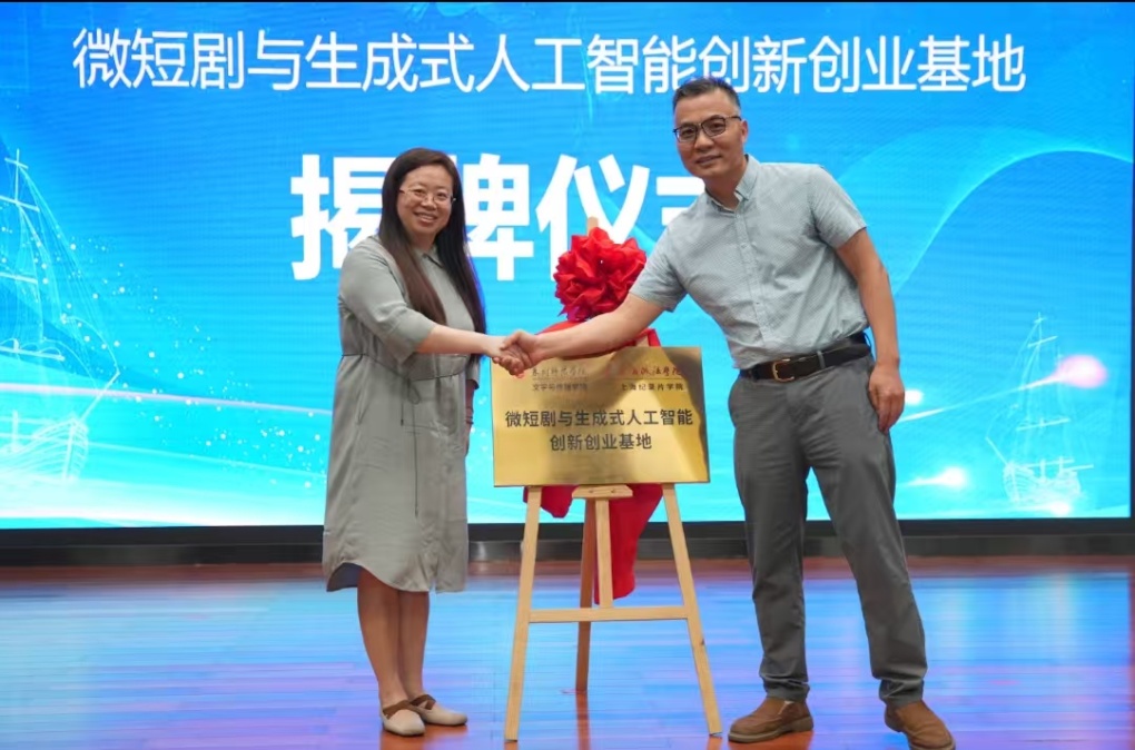 新利18官方客服上海纪录片学院邢虹文副院长与泉州师范学院文学与传播学院王奋飞副院长共同为“微短剧与生成式人工智能创新创业基地”揭牌。