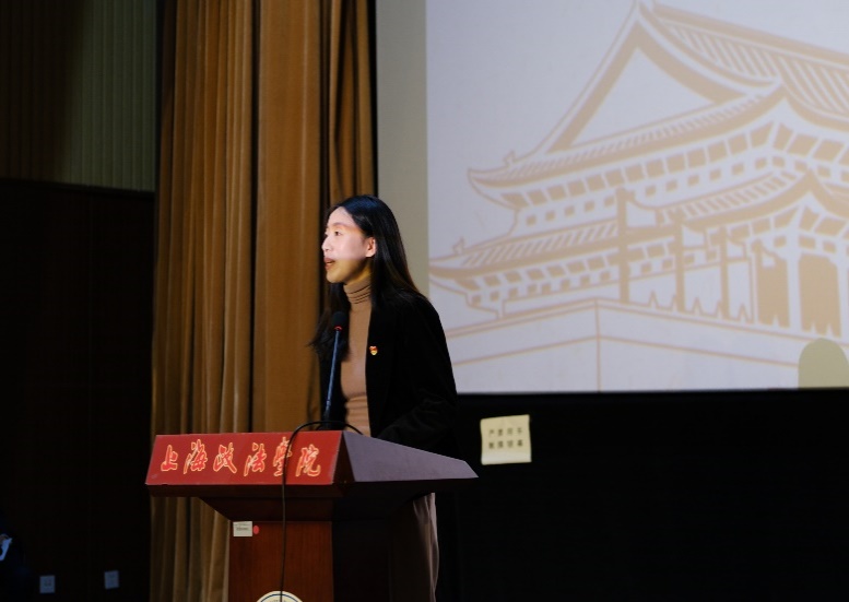 “百折不挠 英勇奋斗”篇章中,上政第37学生党支部书记刘逸君以殷夫等先烈的故事叮嘱同学们要“不忘来时路”。她讲到,正是因为无数革命先烈百折不挠,英勇奋斗,才有了我们现在的生活。作为新时代青年,更需心怀理想信念,关键时刻挺身而出,践行使命担当。党课中,一首诗朗诵《别了,哥哥》带领现场观众穿越时空,深深地认识了那个怀揣崇高理想的少年。