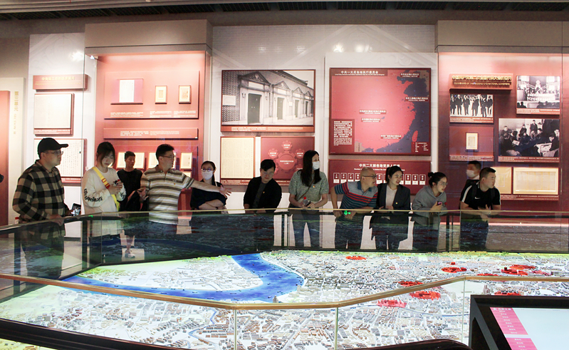 在中共一大纪念馆,师生党员先后参观了“历史选择 伟大起点”“前仆后继 救亡图存”“民众觉醒 主义抉择”“早期组织 星火初燃”“开天辟地 日出东方”“砥砺前行 光辉历程”和“不忘初心 牢记使命 永远奋斗”七大板块,聆听“南陈北李 相约建党”的革命佳话,品味比红糖更甜的“真理味道”。在“光荣之城”多媒体数字沙盘前,师生党员驻足良久,在沙盘上仔细寻找中共中央机关在上海期间领导全国党组织开展革命斗争的重要红色足迹,切身感受共产党人为追求真理,建设新中国所做出的奋斗与牺牲,从中汲取攻坚克难、砥砺奋进的精神力量。