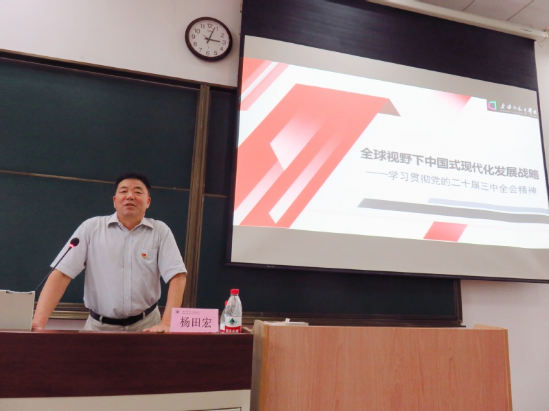 杨田宏为学员们讲授第二堂专题党课“全球视野下中国式现代化发展战略——学习贯彻党的二十届三中全会精神”,从党的二十届三中全会召开的历史背景、《中共中央关于进一步全面深化改革、推进中国式现代化的决定》要点、深刻把握党的二十届三中全会的重要意义等方面进行了深入解读。杨田宏指出,作为青年大学生,要深刻领悟“两个确立”的决定性意义,增强“四个意识”、坚定“四个自信”、做到“两个维护”,切实把思想和行动统一到党中央决策部署上来,把学习宣传贯彻全会精神作为思想自觉和行动自觉。