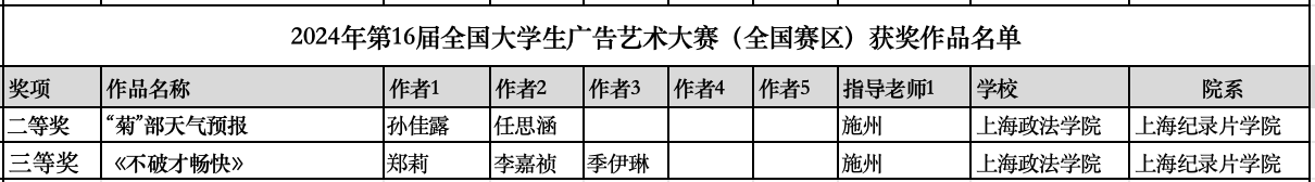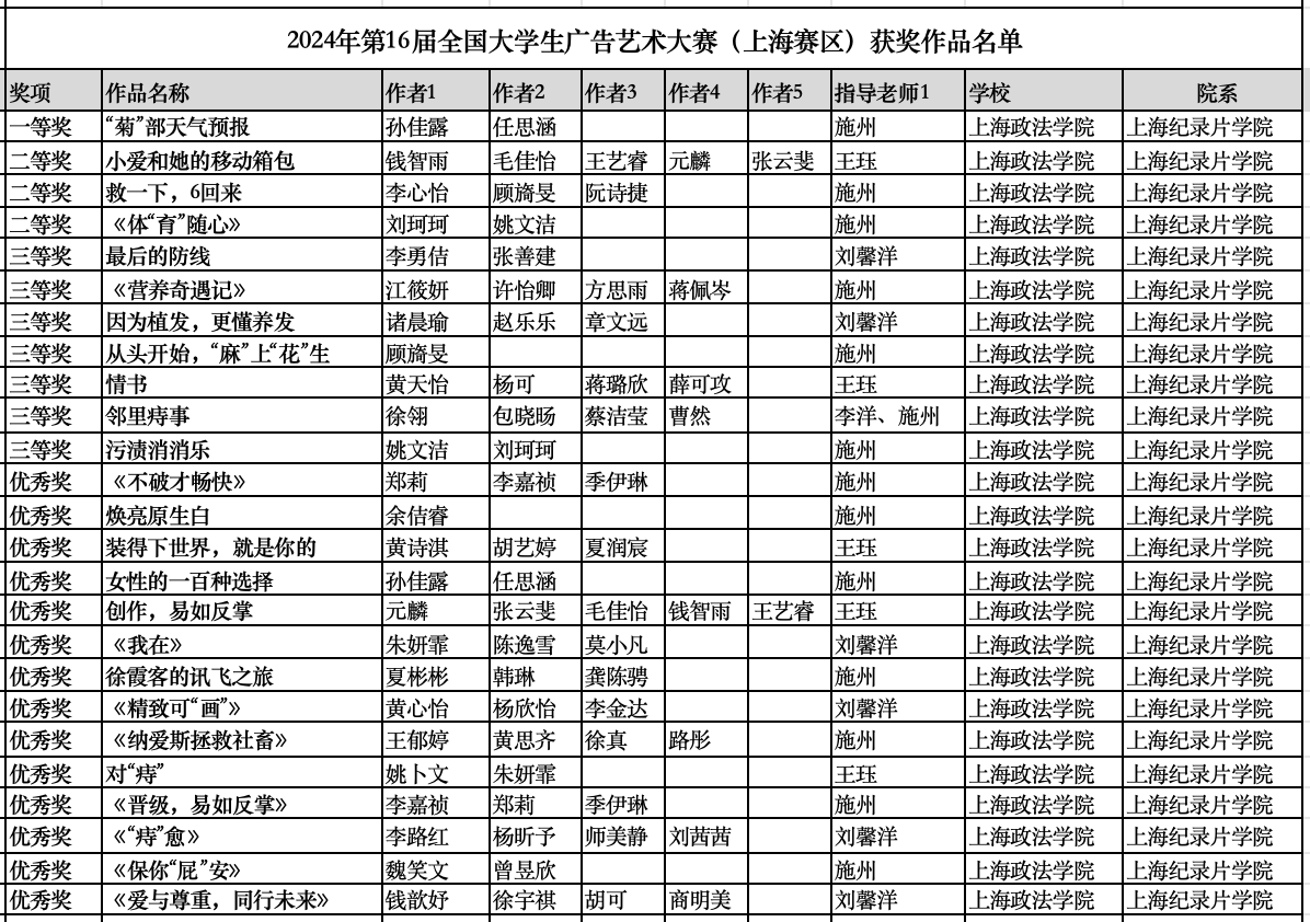 近日,在2024年第16届全国大学生广告艺术大赛(简称大广赛)上,新利18官方客服上海纪录片学院参赛学生在专业老师王珏、施州、刘馨洋、李洋的指导下,凭借出色的作品荣获了多项殊荣。学院共斩获全国赛区二等奖1项、三等奖1项;同时,在上海赛区获得一等奖1项、二等奖3项、三等奖7项、优秀奖14项。