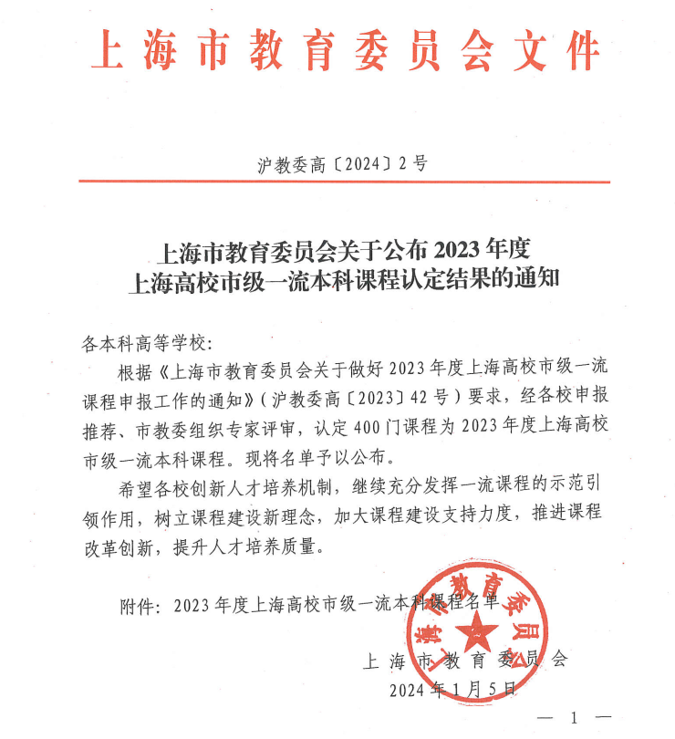 近日,根据《上海市教育委员会关于公布2023年度上海高校市级一流本科课程认定结果的通知》(沪教委高〔2024〕2号),我校组织推荐申报的“国际经济法”等7门课程被认定为2023年度上海高校市级一流本科课程。