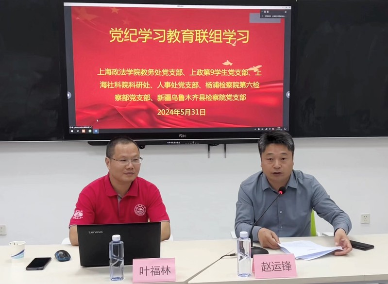 5月31日,教务处党支部、上政第9学生党支部在主教215A开展党纪学习教育联组学习,上海社科院科研处、人事处党支部、杨浦检察院第六检察部党支部、新疆乌鲁木齐县检察院党支部线上参会,共同开展联组学习。会议邀请上海交通大学医学院党校副校长、上海市教卫党委专家宣讲团成员叶福林做党纪学习教育专题学习辅导。联组学习由教务处党支部书记、处长赵运锋主持,联组学习单位的党员参会。