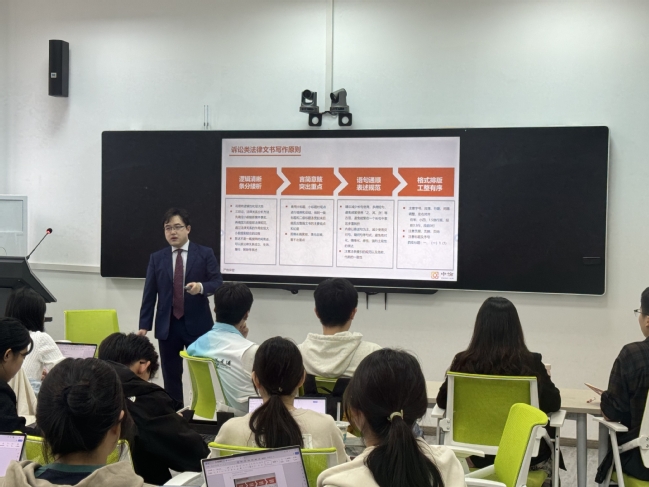 温晗律师以其十一年的商事领域从业经验,为学生们带来了一堂生动且实用的诉讼法律文书写作课程。他详细讲解了法律文书的结构、语言风格、逻辑推理以及如何有效表达法律观点。温律师强调,法律文书是律师专业素养和逻辑思维能力的直接体现,因此撰写时应遵循逻辑清晰、言简意赅、表达规范以及工整有序的原则。他还分享了自己在处理复杂案件时的文书写作技巧,这些宝贵的经验让学生们对法律文书的撰写有了更深入、更直观的理解。
