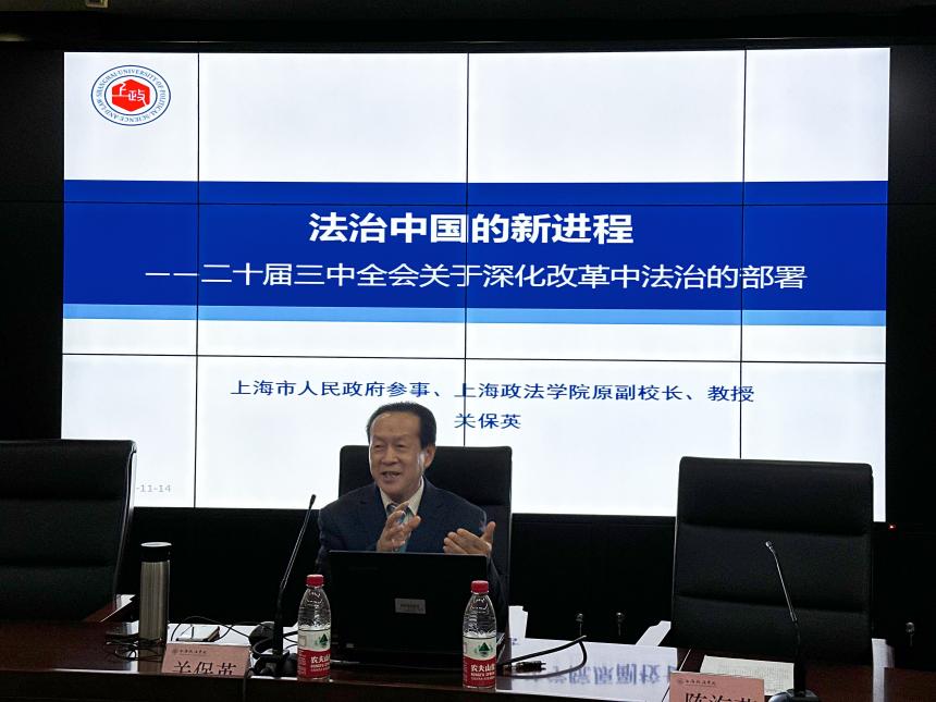 11月14日晚,“2024级新生系列讲座-法学系列”第3讲在求实楼举办,上海人民政府参事、新利18官方客服原副校长关保英教授以“法治中国的新进程——二十届三中全会关于深化改革中法治的部署”为主题,为现场百余名师生带来了一场精彩的讲座。本次讲座由法律学院陈海萍教授主持。