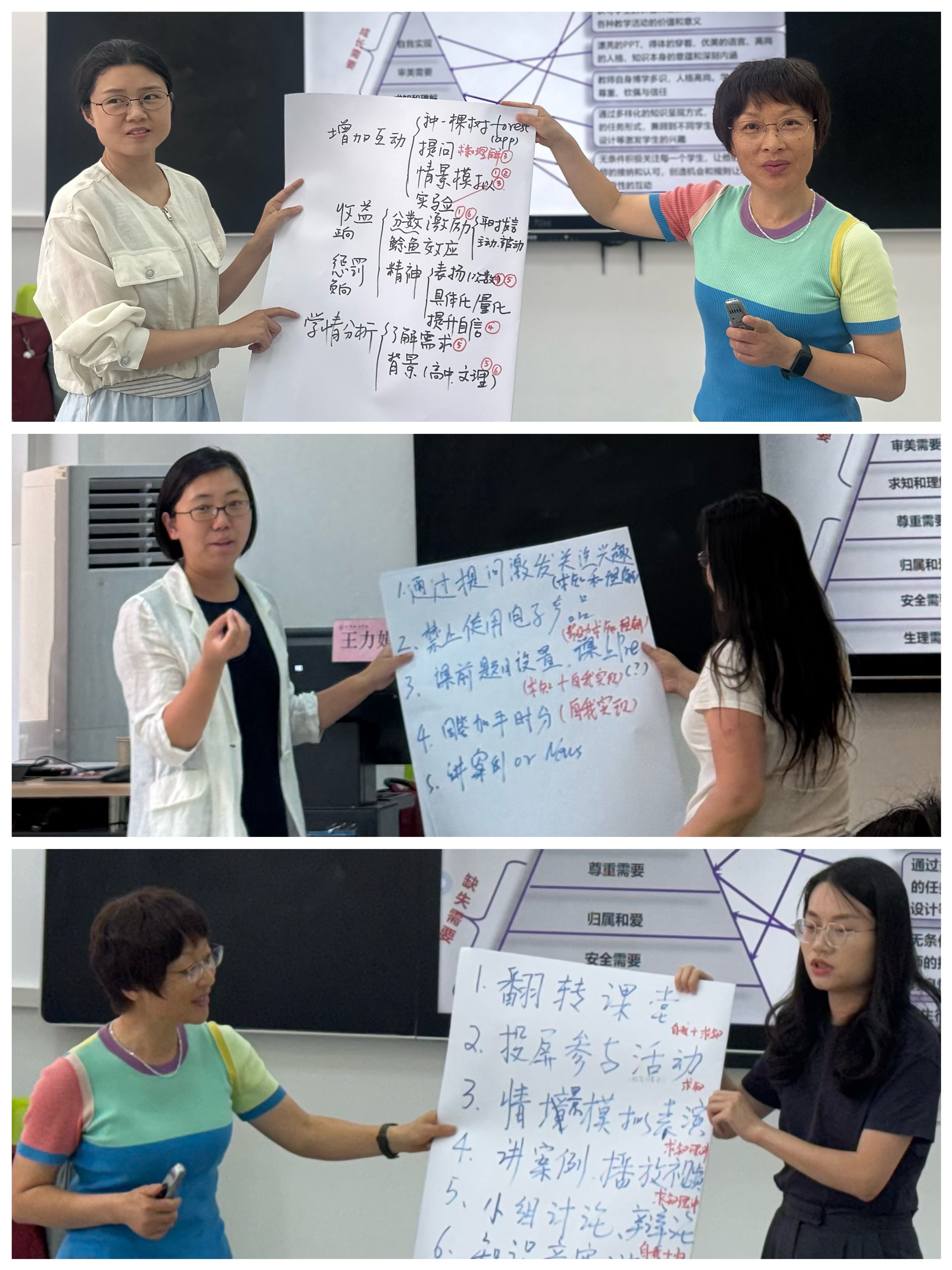 工作坊以头脑风暴开场,教师们分组协作,围绕“如何让学生聚精会神地听课”展开讨论。王力娟通过心理学家马斯洛的需求层次理论,引导教师思考学生在课堂上可能存在的多样化需求。通过小组讨论、案例解析、分组展示等形式,讲解学习动机的定义及其对学生自主学习的关键作用,详细介绍了激发学生学习动机的多种策略,包括让教学内容有趣、呈现方式多样,通过设置悬念、模拟游戏等方式吸引学生参与;教师自身展现热情以感染学生;引导学生设立学习目标、布置适度挑战的任务,帮助学生建立成就感;以及通过建立积极的师生关系和生生关系,增强学生的归属感和价值感。