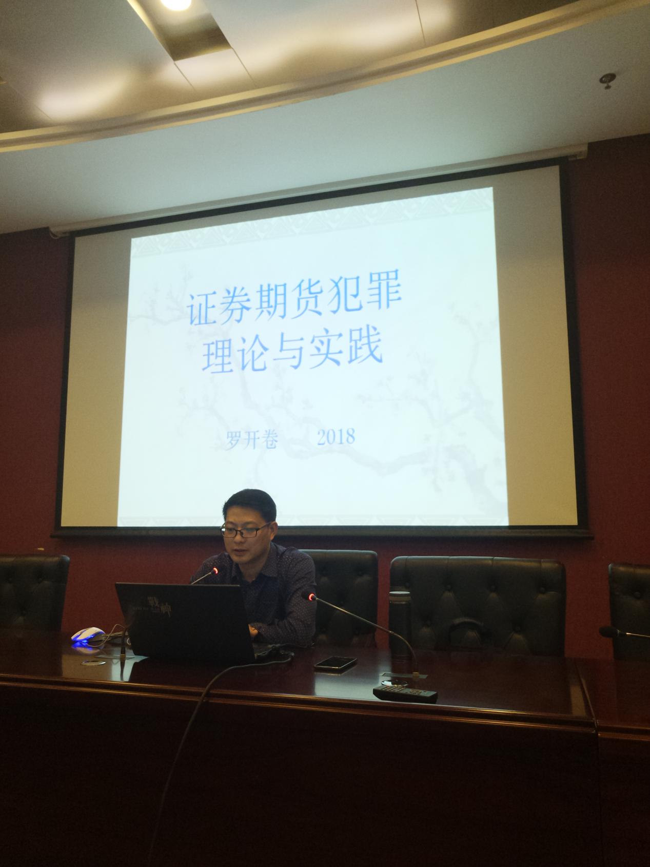 2018年6月2号下午3点,上海市高级人民法院刑庭庭长罗开卷法官在我校综合研究中心107室作了主题为“证券期货犯罪理论与实践”的专题讲座,我院研究生参加了此次讲座。