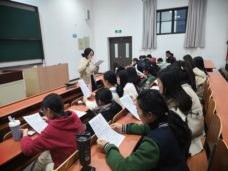 接下来,张亚鑫对合唱团的排练曲目《今天是你的生日,我的中国》进行了细致的指导。这是一首曲调比较平缓的合唱歌曲,表达了歌唱者对祖国的祝福之情,声音纯美动听,有着丰富的情感色彩。因为生疏,一开始同学们唱起来还很有难度,在张亚鑫老师的指引下,同学们的发音逐渐准确,演唱更是逐渐变得张弛有度,收放自如。