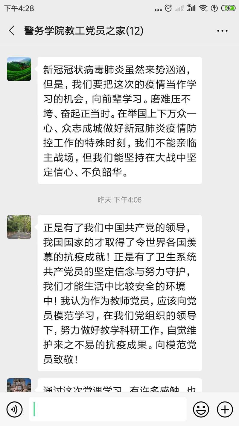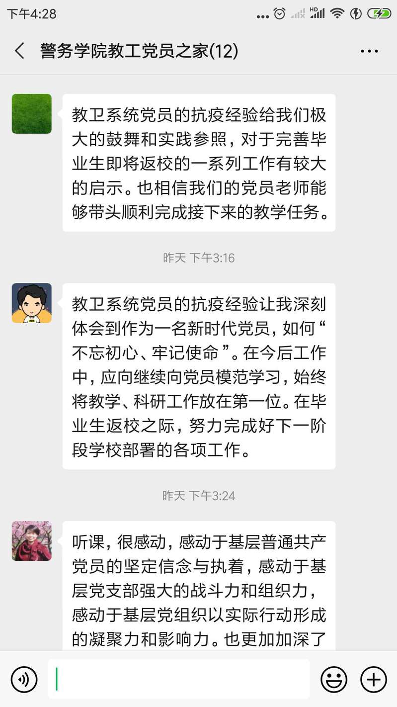 在接下来的党课学习心得交流中,学院广大师生积极发言,警务学院党总支书记马小娜说“听课,很感动,感动于基层普通共产党员的坚定信念与执着,感动于基层党支部强大的战斗力和组织力,感动于基层党组织以实际行动形成的凝聚力和影响力。也更加加深了我们对增强“四个意识”、坚定“四个自信”、做到“两个维护”的理解。”;警务学院常务副院长蔡一军听了党课后结合自己的工作表示“我作为一个从事教育事业的中国共产党员,在教学、科研中,要起到党员的模范带头作用,始终牢记作为一个党员的初心和使命。”;学生支部书记、辅导员王罗超在听了党课后认为“作为一个青年教师在教育教学的过程中应该教育同学们不忘初心、勇担使命,教育同学们树立正确的世界观和价值观,教育同学们做一个国家和社会需要的人,在国家最艰难的时候像白衣战士一样做一个坚定的‘逆行者’”。听完党课,同学们也备受鼓舞,19级监狱学学生姚卓昊表示“此次党课不仅让我感受到了中国人民在面对危机时所做出的突出贡献,更让我感受了党员同志在此次没有硝烟的战役中的英勇事迹,坚定了我入党的决心!”;18级社区矫正学生江越坚定地说“作为一名入党积极分子,作为一名心向中国共产党的大学生,我会积极向优秀的党员榜样学习,做一名有朝气、有活力、有担当的青年党员,正如入党誓词说的那样,随时准备为党和人民牺牲一切”。