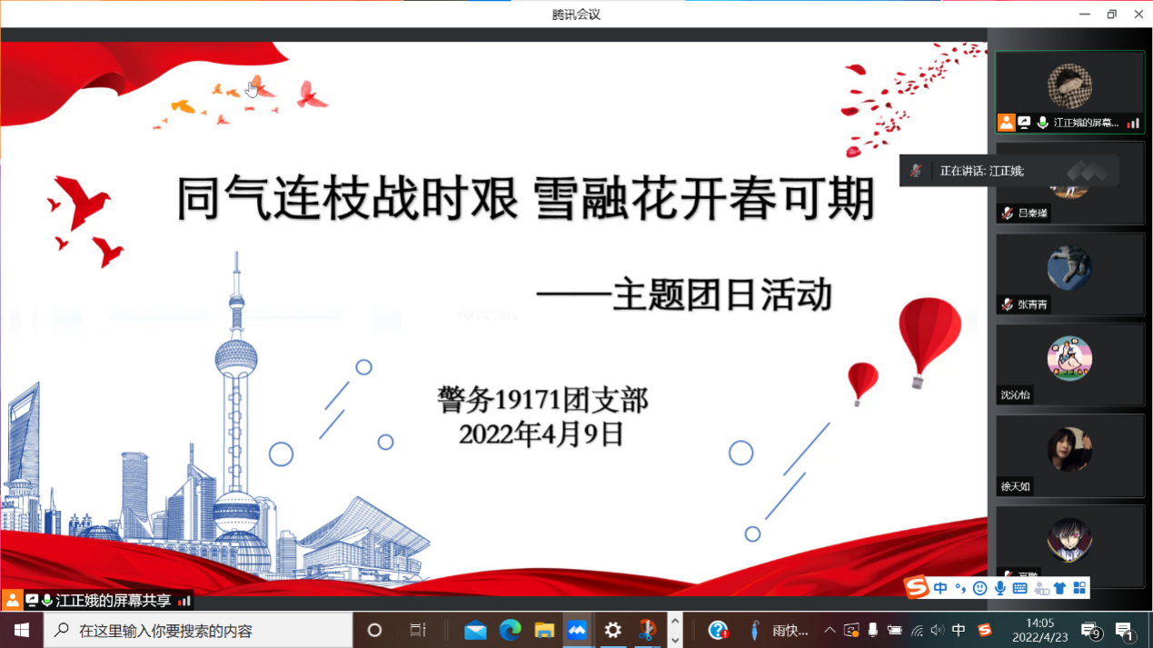 在团日活动中,警务学院各团支部成员共同学习了新冠肺炎疫情防控的科普知识以及上海市团校线上团课,对学校防疫政策进行了深入理解,最终达成“严格遵守学校指示,认真做好自身防护”的共识。