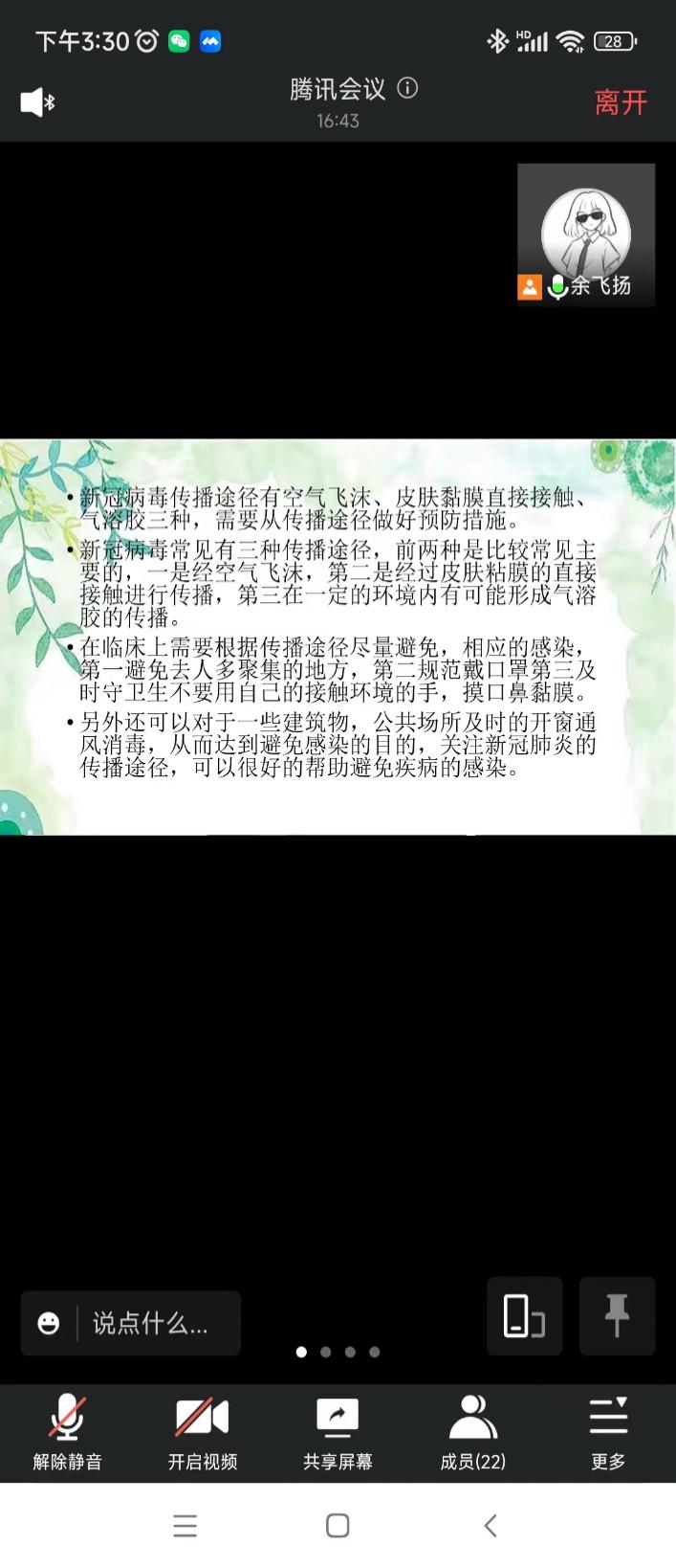 各支部团支书向支部成员们系统地介绍了新冠病毒的多种传播方式,引领成员学习防疫知识。同时关注同学们隔离期间的心理健康状态,引导支部成员遵守学校防疫政策,认真做好自身防护,齐心协力,共克时艰。