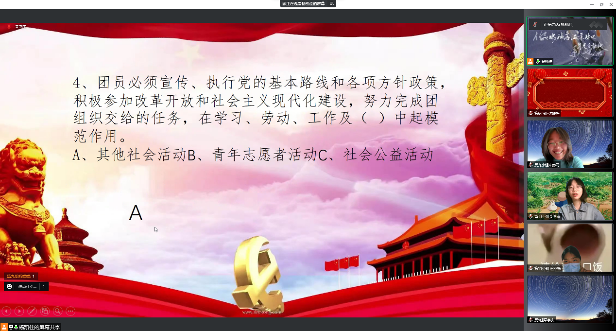 随后,激烈的抢答环节扣人心弦,通过考验同学们对于党团知识的掌握程度,还考验了同学们的反应。抢答环节使比赛气氛迅速升温,队伍竞争十分激烈。经过数轮抢答,最终第11队(组长余飞扬)获得一等奖,第4队(组长李婷婷)、第8队(组长王宇轩)获得二等奖,第1队(组长郭骏杰)、第3队(组长孙昊天)、第9队(组长章宇庆)获得三等奖。