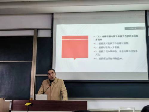 讲座第三部分,张晶教授从逻辑视野讲解了中国式监狱工作现代化的发展,对“现代化文明监狱”一词对此做出准确定义,明确监狱工作方向的外延是建造世界上最安全的监狱,重点在于改造,而不是简单的监禁,并强调改造的重心在于把一个社会主义安全的破坏者改造成社会主义的建造者,把一个腐朽的人改造成一个有用的人,把一个消极的因素改造成一个积极的因素。